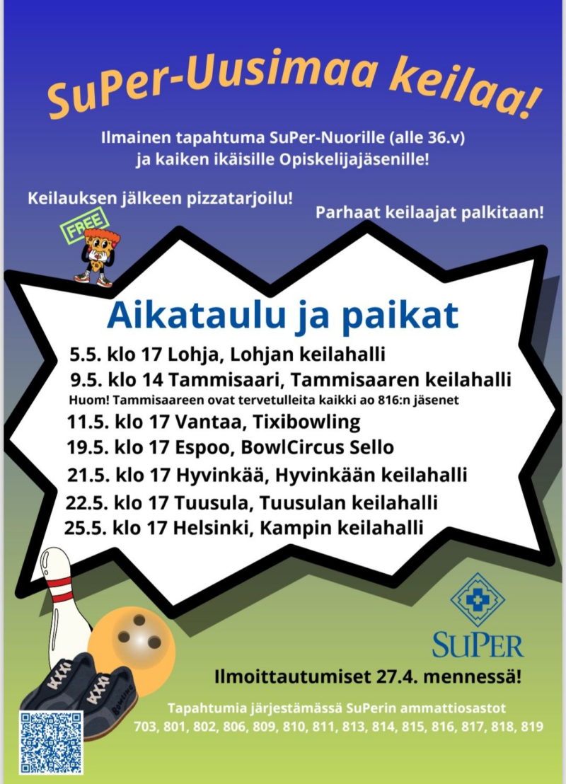 Lohjalla keilaus + ruokailu 5.5.2026, SuPer-nuorille (alle 36v. varsinaiset jäsenet) + opiskelijat!